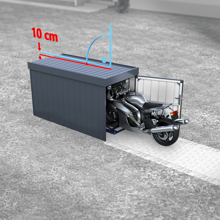 Die STEVIK Motorradgarage von Baudiscount kombiniert praktisches Design mit sicherer und eleganter Bauweise. Diese Motorradgarage ist aus hochwertigem, feuerverzinktem und pulverbeschichtetem Stahl gefertigt, was einen langlebigen Schutz gegen alle Witterungseinflüsse garantiert. Ideal für Motorradbesitzer, die Wert auf Funktionalität und Ästhetik legen, bietet diese Garage eine solide und attraktive Lösung für die sichere Aufbewahrung Ihres Motorrads für Jahrzehnte.